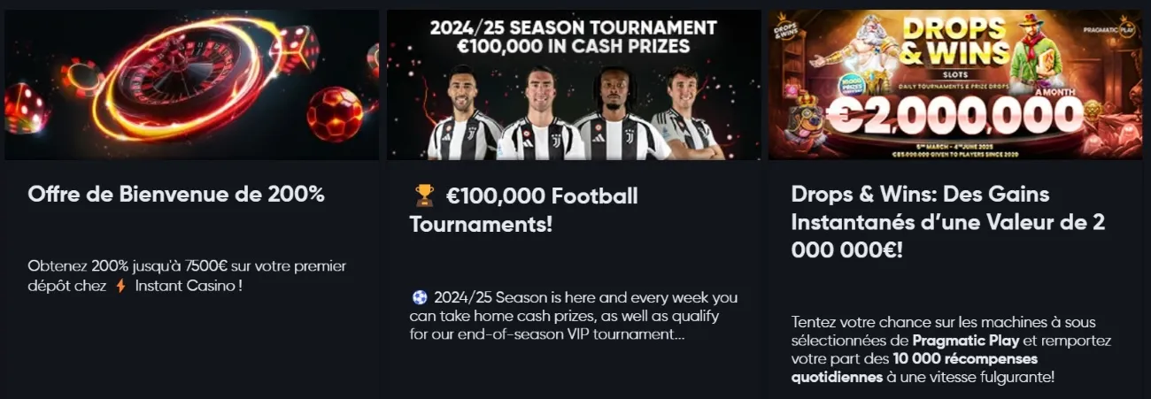 Vous aurez l’embarras du choix entre plusieurs offres lucratives pour augmenter vos gains. Pas de code promo au InstantCasino, aucun souci à l’horizon.